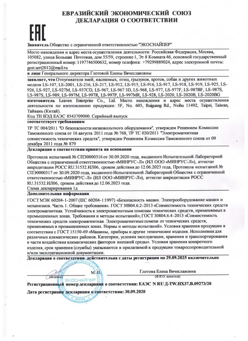 Приобрести отпугиватель собак «Экоснайпер LS-977F» по доступной цене в Электроуглях очень просто: для этого достаточно оставить заявку нашим операторам по телефону или в онлайн-чате.